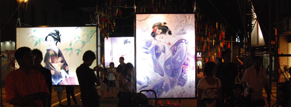 期間中、家々では青竹に五色の短冊や吹流し等をつり下げて門前に飾るほか、浮世絵美人が描かれた大・小数百個の絵どうろうが通りに下げられます。 日暮れ時ともなれば、これらの絵どうろうに一斉に灯がともされ、市内一円が一大不夜城と化します。その色彩と優雅さは、全国にも例のないお祭りです。