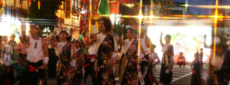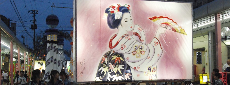 期間中、家々では青竹に五色の短冊や吹流し等をつり下げて門前に飾るほか、浮世絵美人が描かれた大・小数百個の絵どうろうが通りに下げられます。 日暮れ時ともなれば、これらの絵どうろうに一斉に灯がともされ、市内一円が一大不夜城と化します。その色彩と優雅さは、全国にも例のないお祭りです。